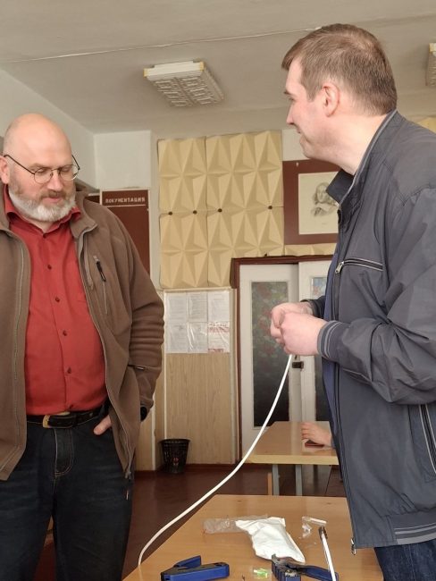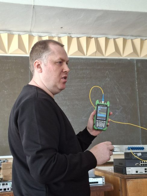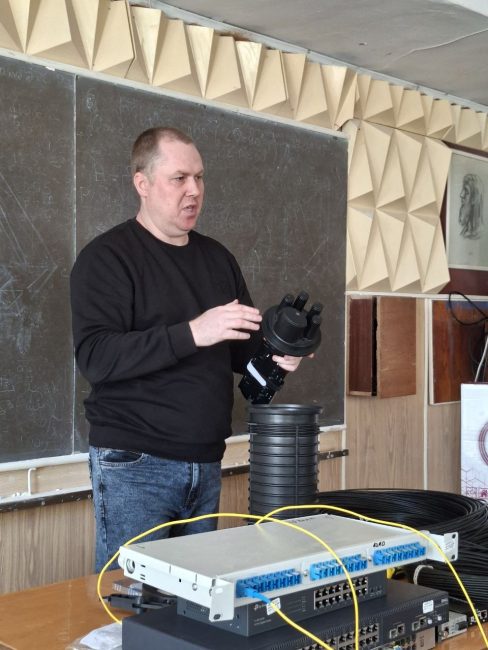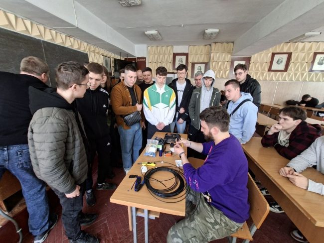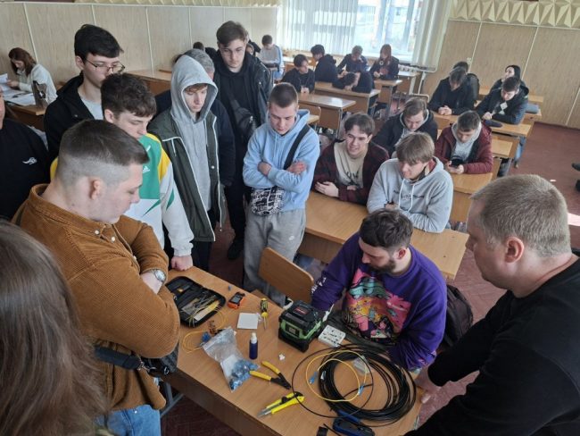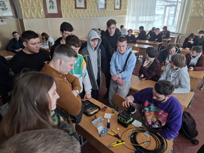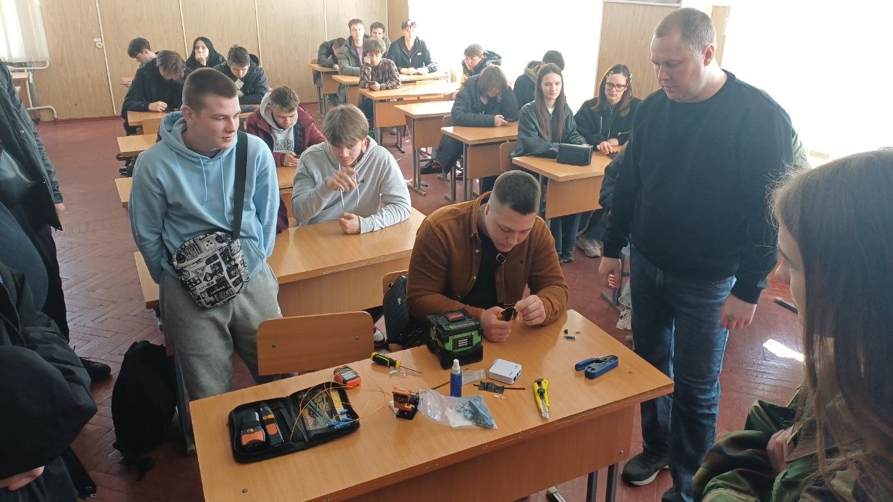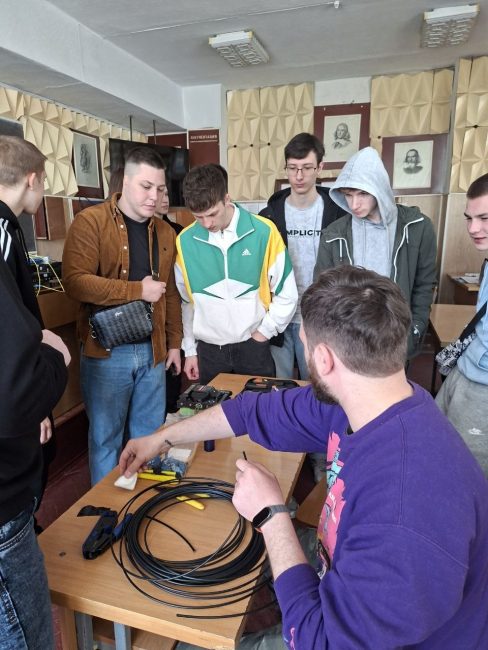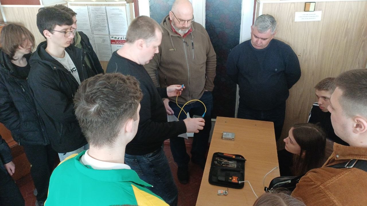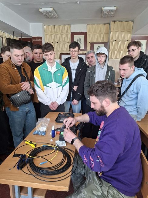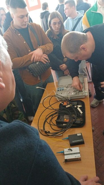 Під керівництвом спеціаліста технічної підтримки Миколи Володимировича Шимківа студенти відпрацювали навички зварювання оптоволоконного кабелю із застосуванням сучасних зварювальних апаратів. Особливу увагу було приділено техніці безпеки, організації робочого місця та дотриманню вимог охорони праці. Як ветеран ЗСУ та військовий зв’язківець, фахівець акцентував на важливості дисципліни та відповідальності під час роботи з телекомунікаційним обладнанням.