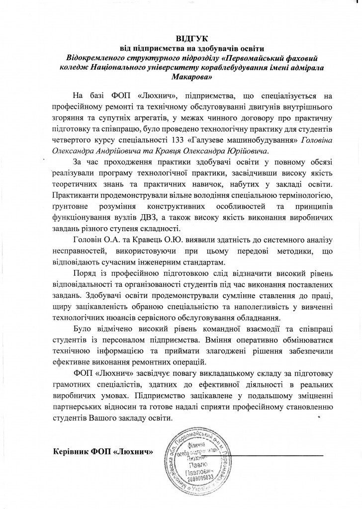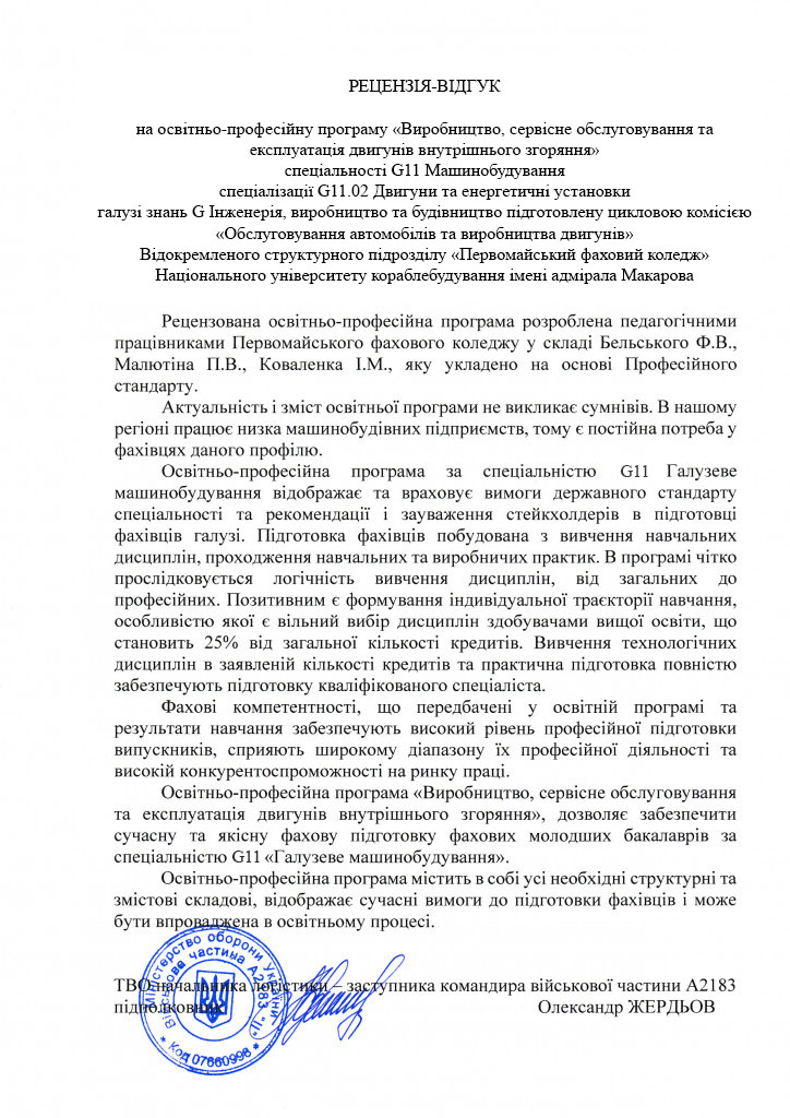 Комплекс спеціальних дисциплін, що вивчають студенти освітньо-професійної програми «Виробництво, сервісне обслуговування та експлуатація двигунів внутрішнього згоряння» дає розуміння сучасного стану енергетичних установок с ДВЗ, методів їх виробництва і ремонту з урахуванням новітніх тенденцій розвитку світового двигунобудування, готує майбутніх фахівців до самостійної діяльності.